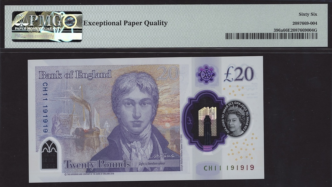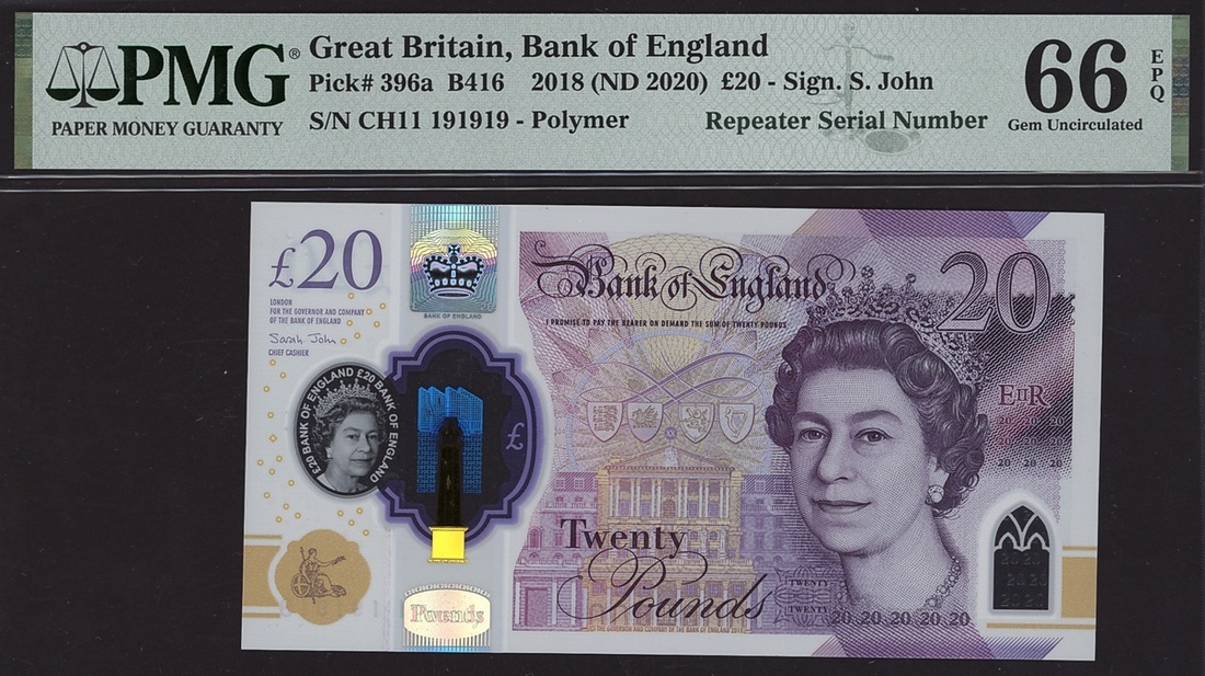 Bank of England, S. John, polymer £20, 2018 (ND 2020), repeater serial number CH11 191919, (EPM B416, Pick 396a), in PMG holder 66 EPQ Gem Uncirculated