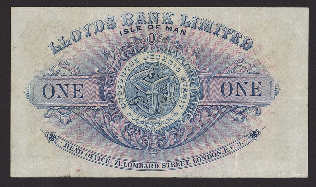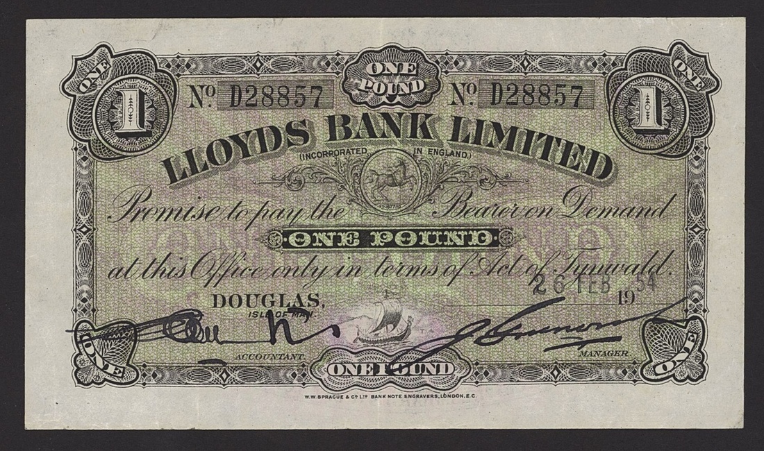 Lloyds Bank Limited, Isle of Man, 1 pound, 1954, serial number D28857, (M 338, Pick 12e), about uncirculated