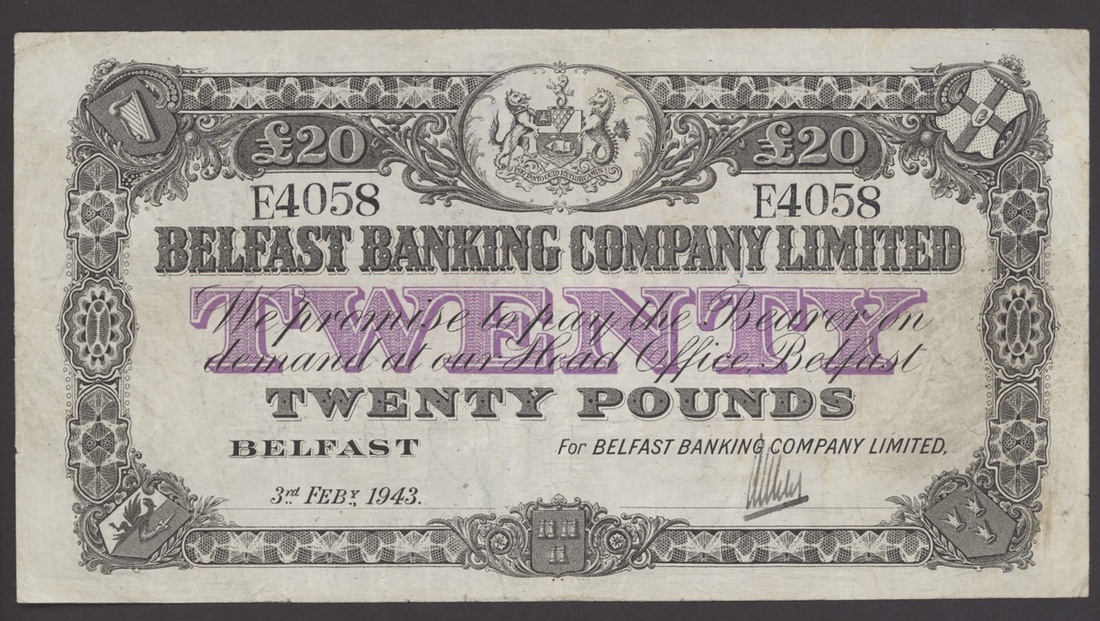 Belfast Banking Company, Northern Ireland, 20 pounds, 1943, serial number E4058, (PMI BB 79, Pick 129c), fine, pen and pencil annotations on reverse