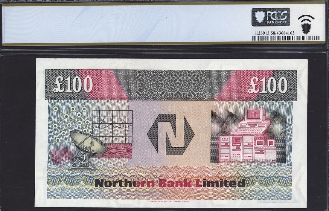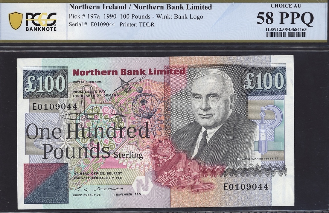 Northern Bank Limited, Northern Ireland, 100 pounds, 1990, serial number E0109044, (PMI NR 118, Pick 197a), in PCGS holder 58 PPQ Choice About Uncirculated