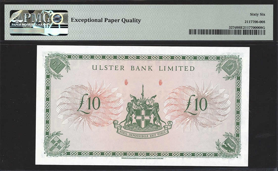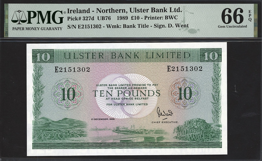 Ulster Bank Limited, Northern Ireland, 10 pounds, 1989, serial number E2151302, (PMI Ub76, Pick 327d), in PMG holder 66 EPQ Gem Uncirculated