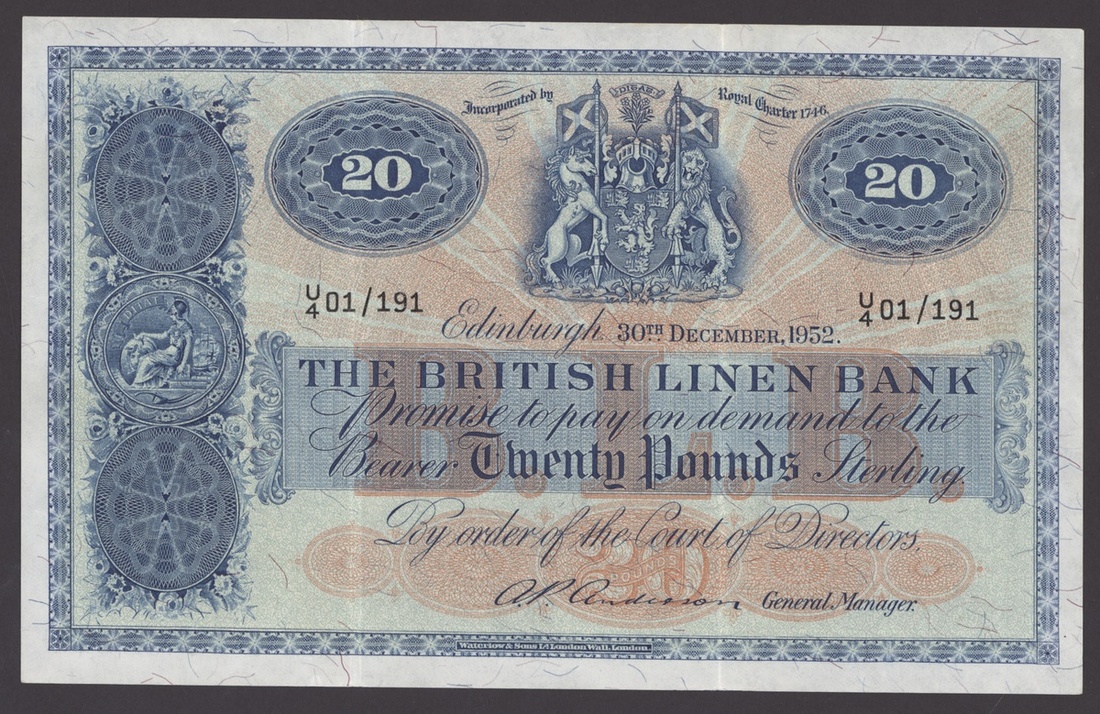 The British Linen Bank, Scotland, 20 pounds, 1952, serial number U/4 01/191, (PMS BL68e, Pick 159b), very fine