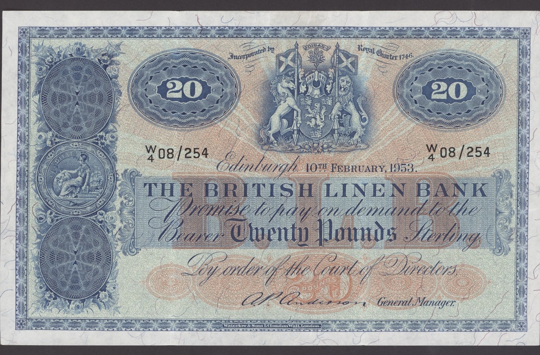 The British Linen Bank, Scotland, 20 pounds, 1953, serial number W/4 08/254, (PMS BL68e, Pick 159b), very fine