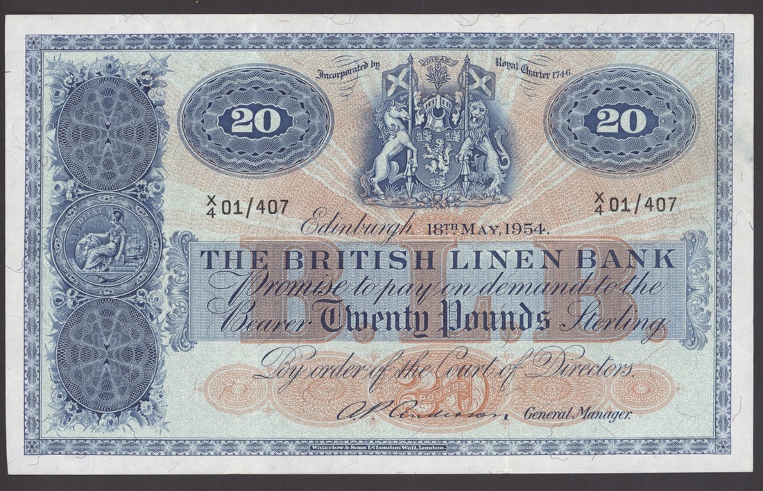 The British Linen Bank, Scotland, 20 pounds, 1954, serial number X/4 01/407, (PMS BL68e, Pick 159b), very fine