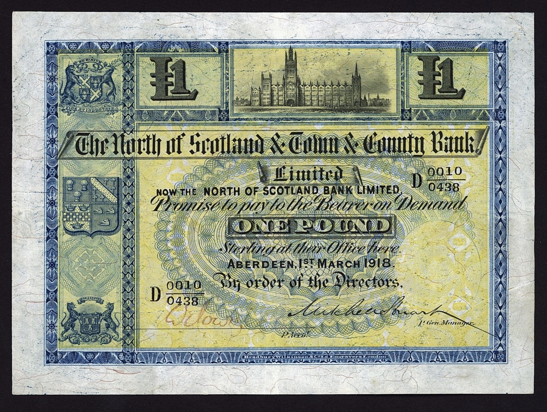 The North of Scotland & Town & County Bank, 1 pound, 1918, serial number D 0010 0438, (PMS NS31, Pick S633b), about uncirculated