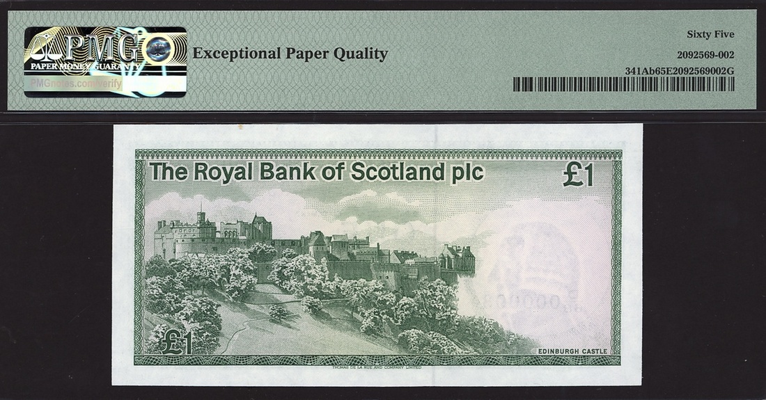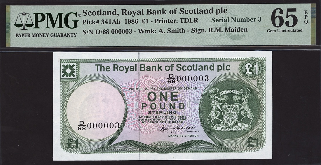 The Royal Bank of Scotland, £1, 1986, serial number D/68 000003, (PMS RB80d, Pick 341Ab), in PMG holder 65 EPQ Gem Uncirculated, only one note in higher grade on PMG Census