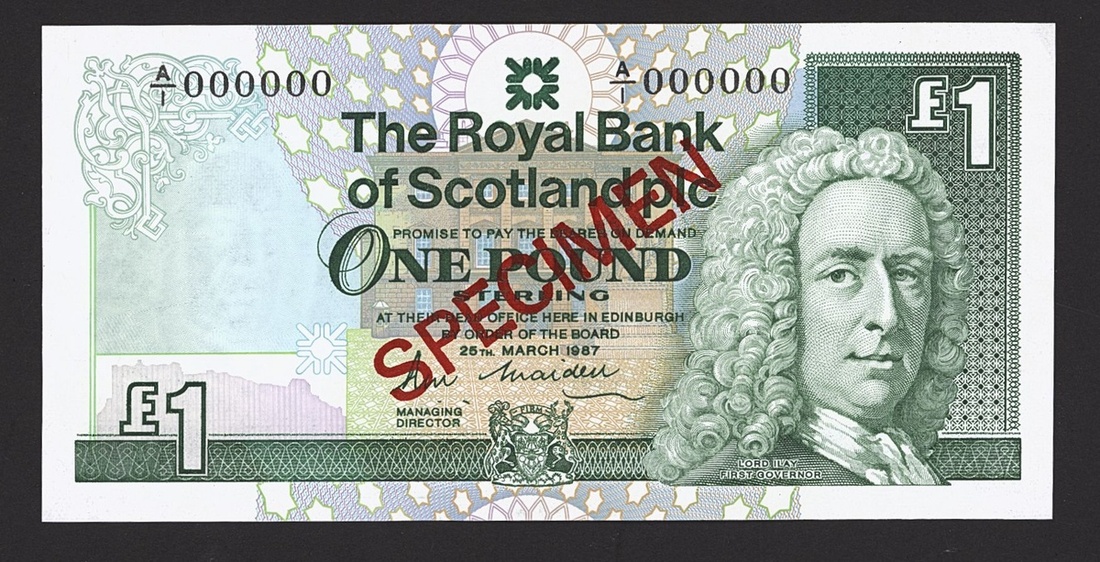 The Royal Bank of Scotland, specimen £1, ND (1987-90), serial number A/1 000000, Maiden signature