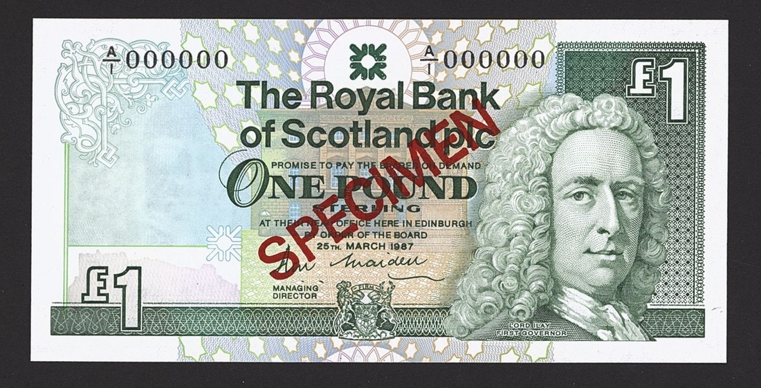 The Royal Bank of Scotland, specimen £1, ND (1987-90), serial number A/1 000000, Maiden signature