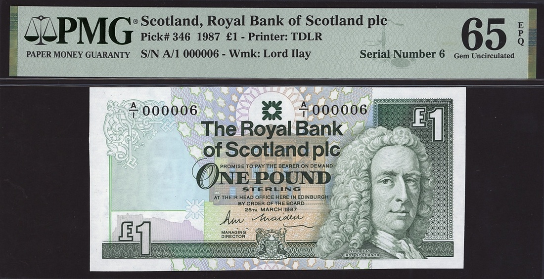 The Royal Bank of Scotland, £1, 1987, serial number A/1 000006, (PMS RB85, Pick 346a), in PMG holder 65 EPQ Gem Uncirculated