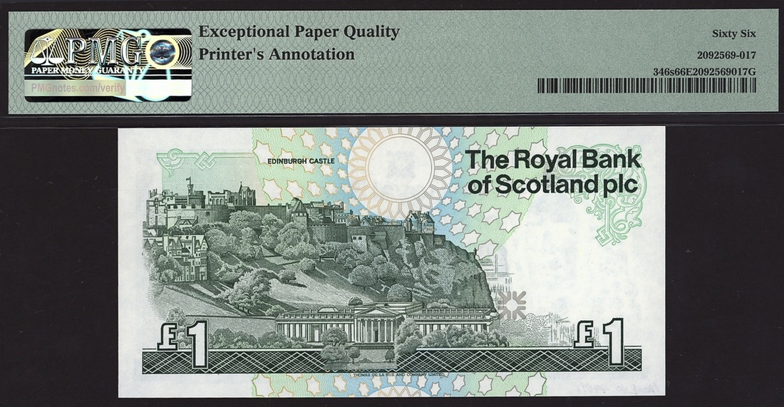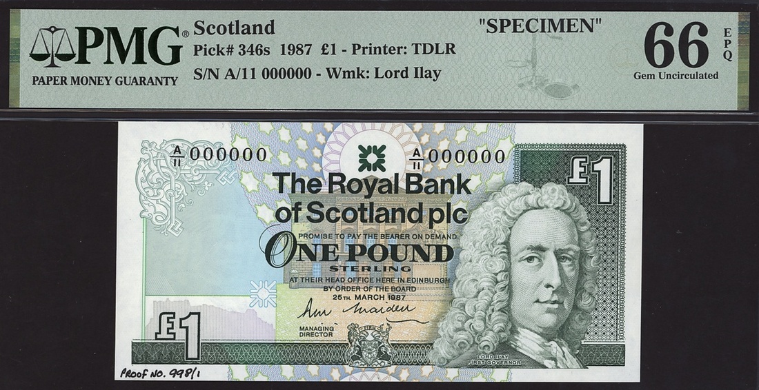 The Royal Bank of Scotland, [Top Pop] specimen £1, ND (1987-90), serial number A/11 000000, (PMS RB85, Pick 346s), in PMG holder 66 EPQ Gem Uncirculated, printer's annotation (PROOF NO. 9981)