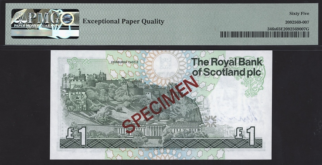 The Royal Bank of Scotland, specimen £1, ND (1987-90), serial number A/1 000000, (PMS RB85, Pick 346s), in PMG holder 65 EPQ Gem Uncirculated, countersigned by Robert M, Maiden (Courtesy Autograph)