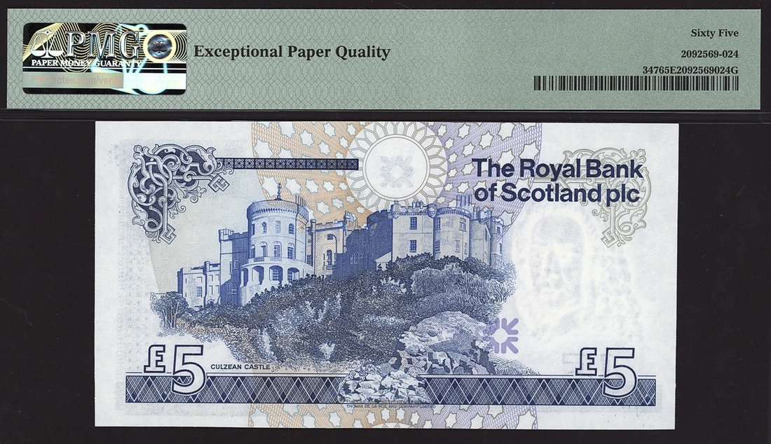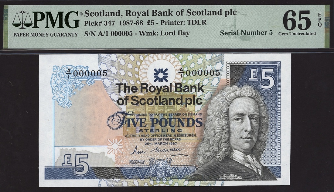 The Royal Bank of Scotland, £5, ND (1987-90), serial number A/1 000005, (PMS RB86, Pick 347a), in PMG holder 65 EPQ Gem Uncirculated
