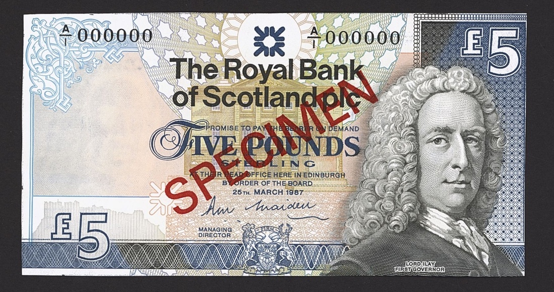 The Royal Bank of Scotland, specimen £5, ND (1987-88), serial number A/1 000000, (PMS RB86, Pick 347s), cut out, good extremely fine