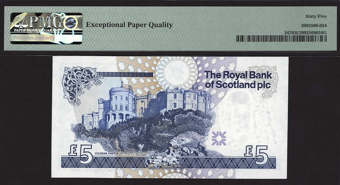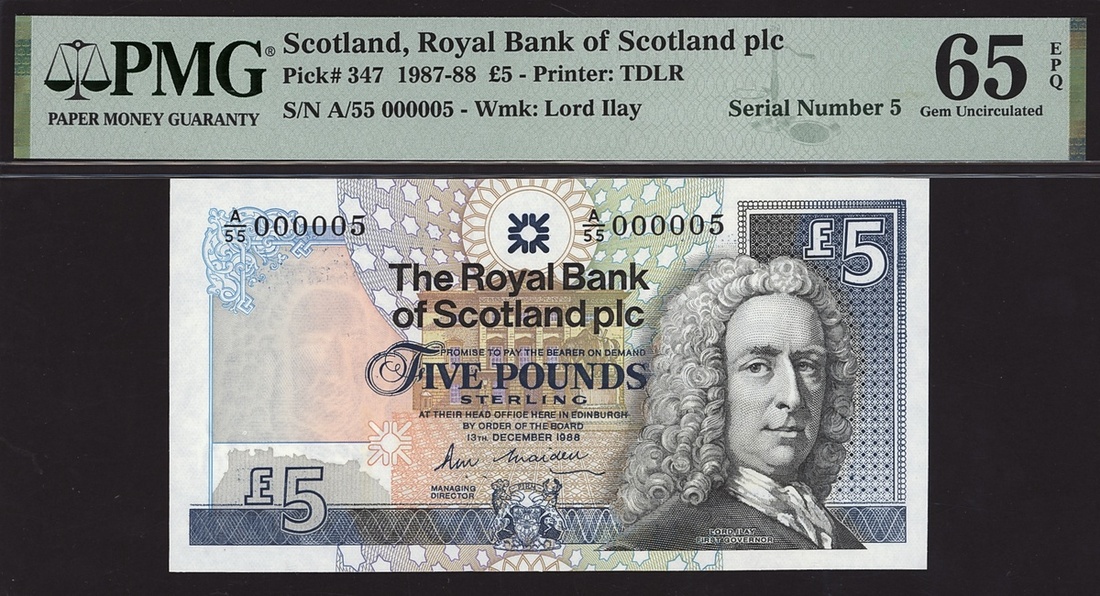 The Royal Bank of Scotland, £5, 1988, serial number A/55 000005, (PMS RB86, Pick 347), in PMG holder 65 EPQ Gem Uncirculated