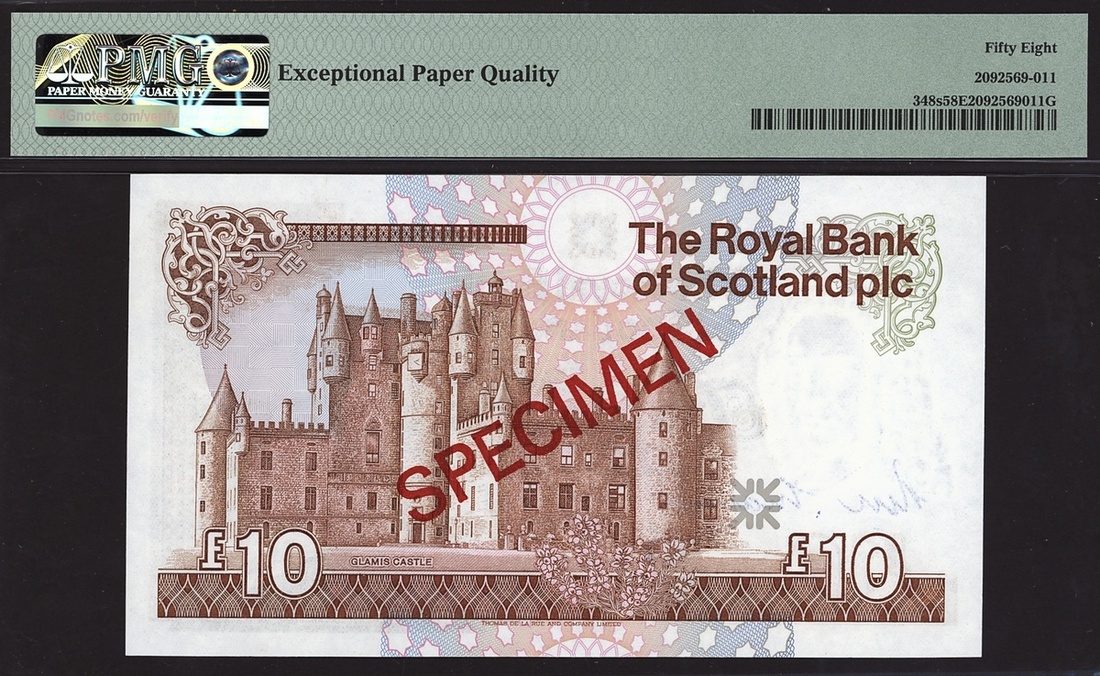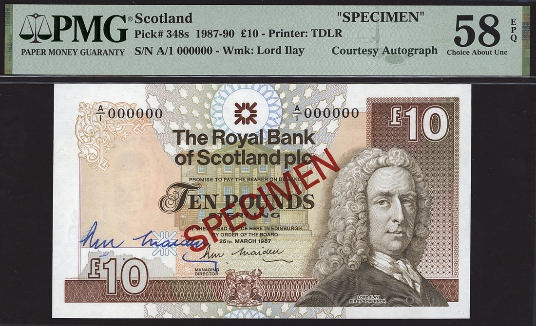 The Royal Bank of Scotland, specimen £10, ND (1987-90), serial number A/1 000000, (PMS RB87, Pick 348s), in PMG holder 58 EPQ Choice About Uncirculated, countersigned by Robert M, Maiden (Courtesy Autograph)