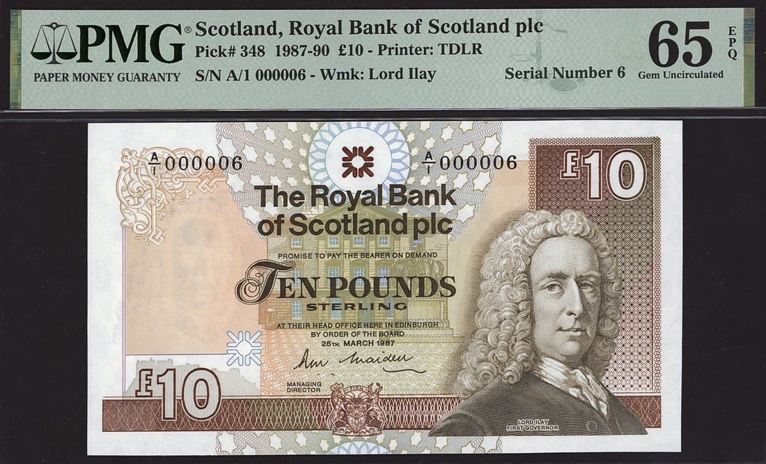 The Royal Bank of Scotland, £10, 1987, serial number A/1 000006, (PMS RB87, Pick 348), in PMG holder 65 EPQ Gem Uncirculated