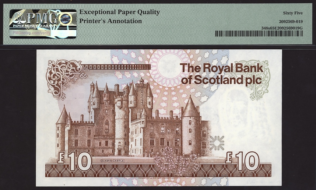The Royal Bank of Scotland, specimen £10, ND (1987-90), serial number A/11 000000, (PMS RB87, Pick 348s), in PMG holder 65 EPQ Gem Uncirculated, printer's annotation (PROOF NO. 940/3)