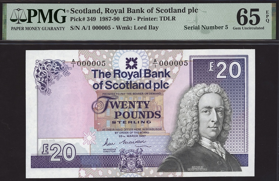 The Royal Bank of Scotland, £20, ND (1987-90), serial number A/1 000005, (PMS RB88, Pick 349a), in PMG holder 65 EPQ Gem Uncirculated