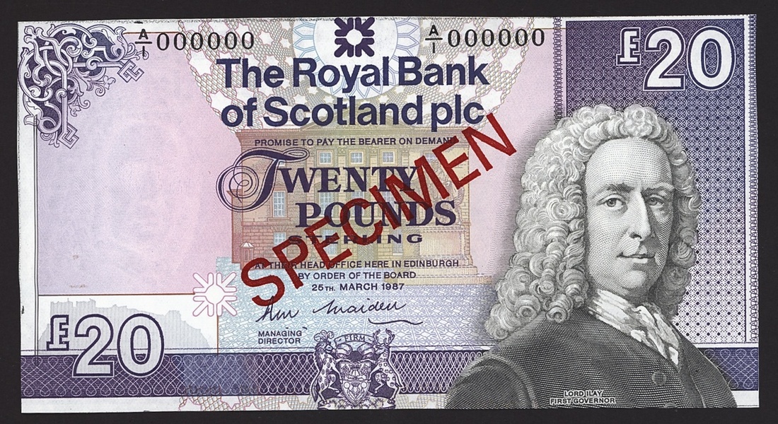 The Royal Bank of Scotland, specimen £20, ND (1987-90), serial number A/1 000000, Maiden signature