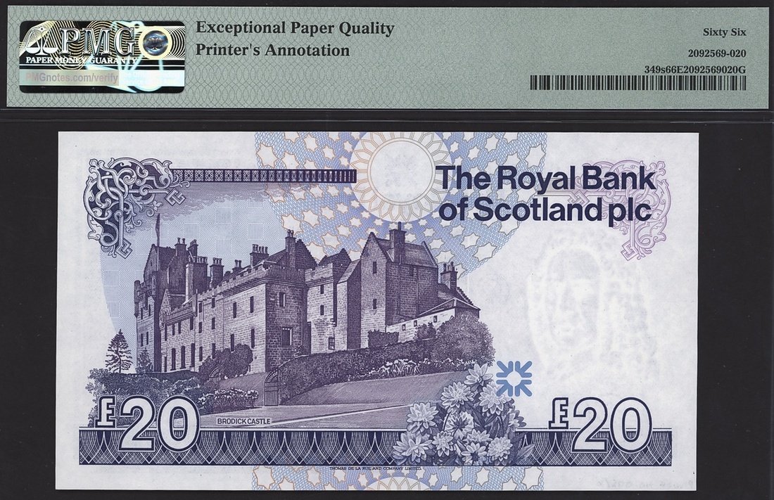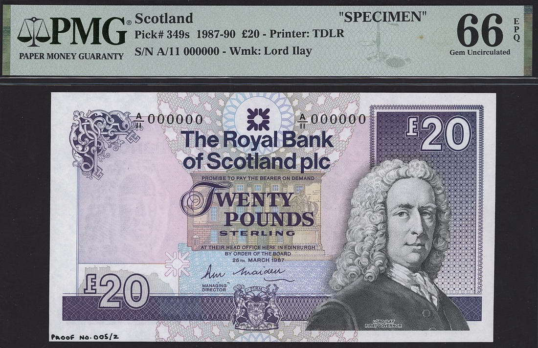 The Royal Bank of Scotland, specimen £20, 1987, serial number A/11 000000, (PMS RB88, Pick 349s), in PMG holder 66 EPQ Gem Uncirculated, printer's annotation (PROOF NO. 005/2)