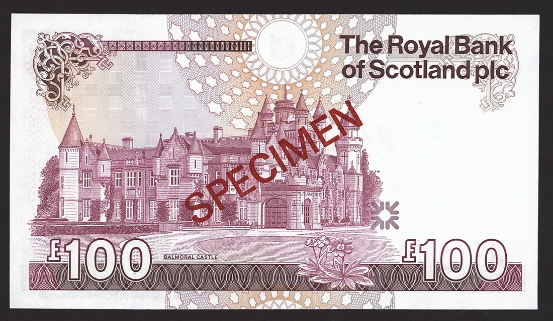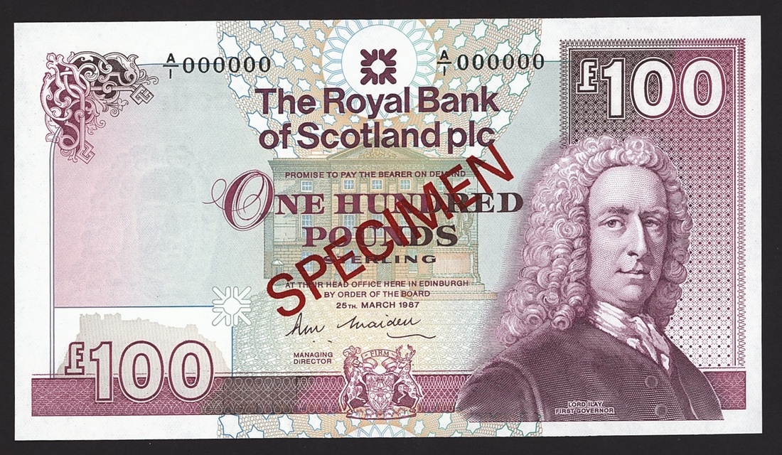 The Royal Bank of Scotland, specimen £100, ND (1987-90), serial number A/1 000000, Maiden signature
