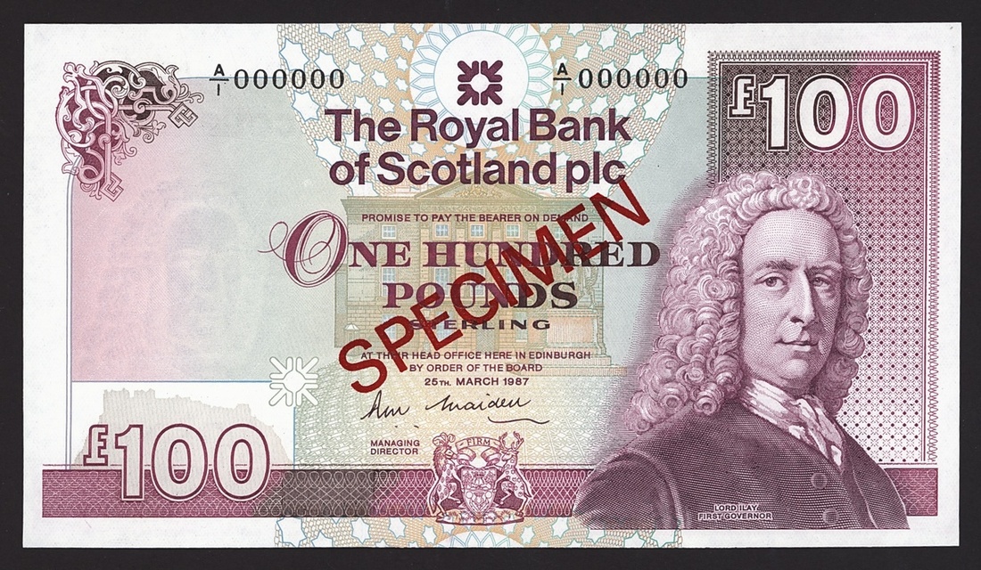 The Royal Bank of Scotland, specimen £100, ND (1987-90), serial number A/1 000000, Maiden signature