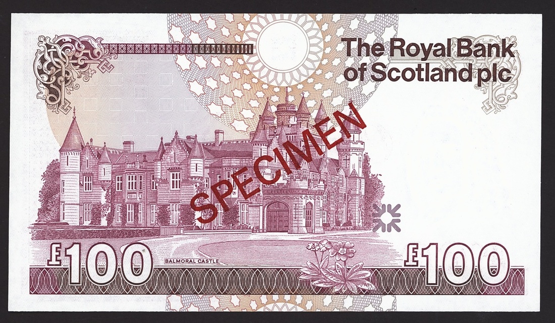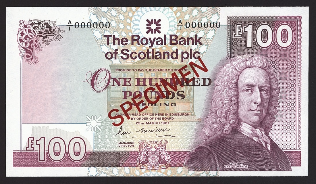 The Royal Bank of Scotland, specimen £100, ND (1987-90), serial number A/1 000000, Maiden signature