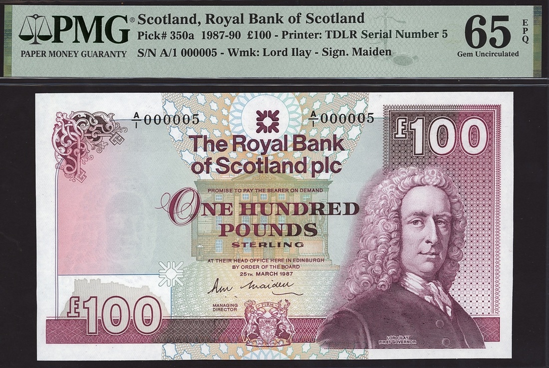The Royal Bank of Scotland, £100, ND (1987-90), serial number A/1 000005, (PMS RB89, Pick 350a), in PMG holder 65 EPQ Gem Uncirculated
