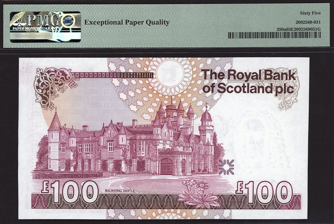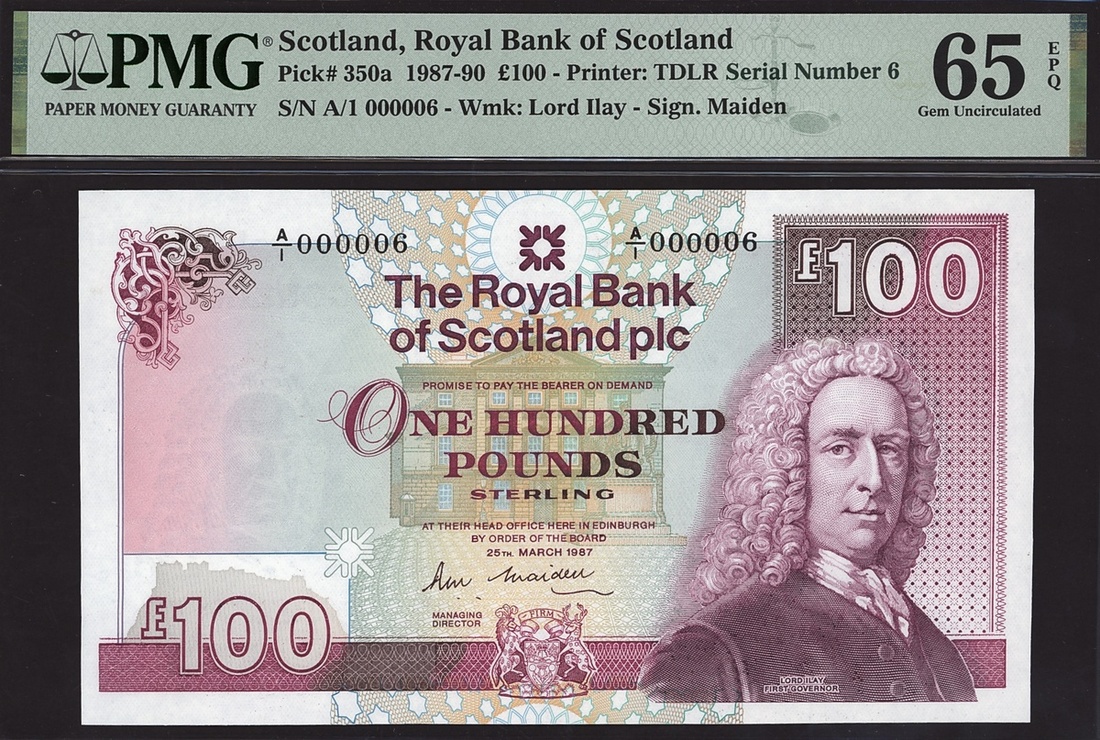 The Royal Bank of Scotland, £100, 1987, serial number A/1 000006, (PMS RB89, Pick 350a), in PMG holder 65 EPQ Gem Uncirculated