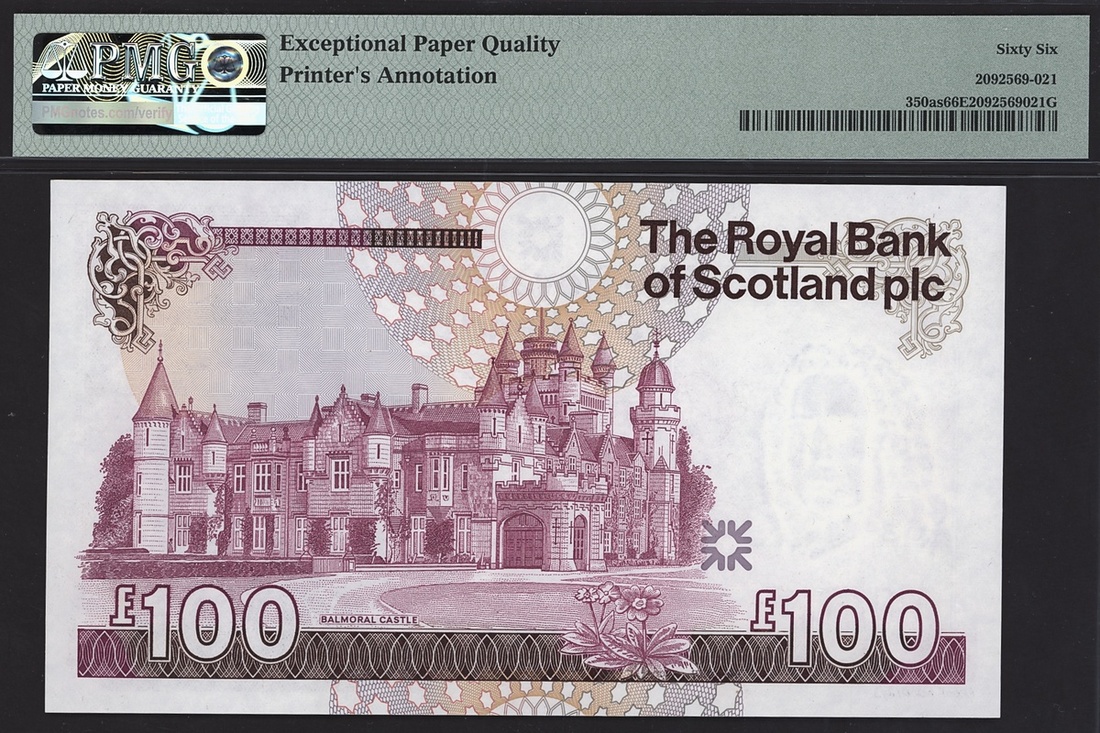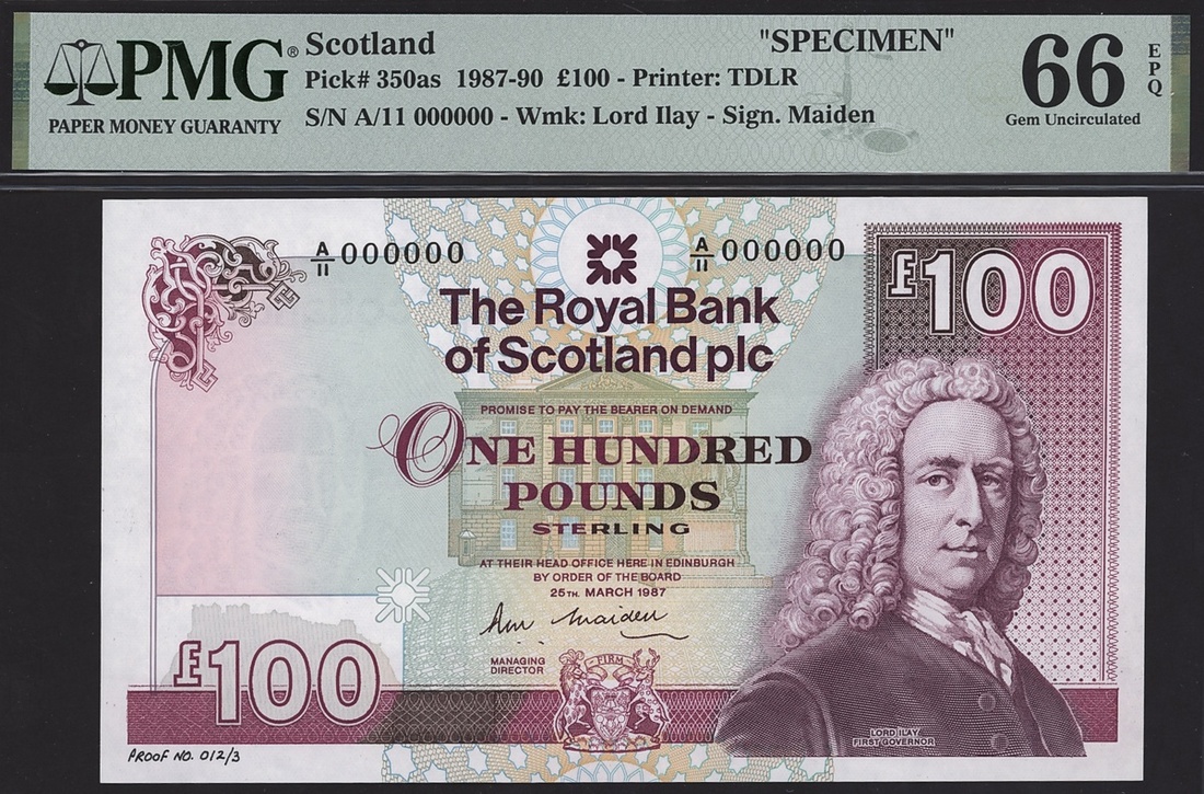 The Royal Bank of Scotland, [Top Pop] specimen £100, ND (1987-90), serial number A/11 000000, (PMS RB89, Pick 350s), in PMG holder 66 EPQ Gem Uncirculated, printer's annotation (PROOF NO. 012/3)