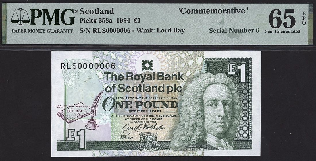 The Royal Bank of Scotland, £1, 1994, serial number RLS0000006 (PMS RB91, Pick 358a), in PMG holder 65 EPQ Gem Uncirculated