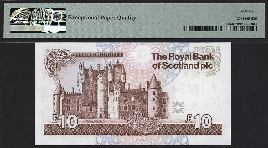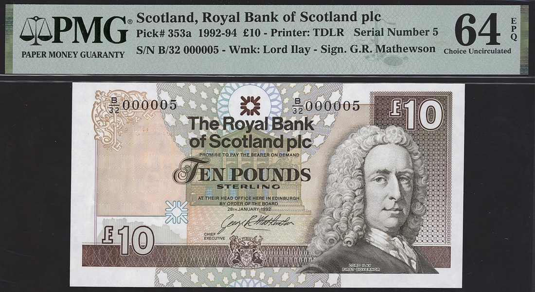 The Royal Bank of Scotland, £10, 1992, serial number B/32 000005, (PMS RB103a, Pick 353a), in PMG holder 64 EPQ Gem Uncirculated