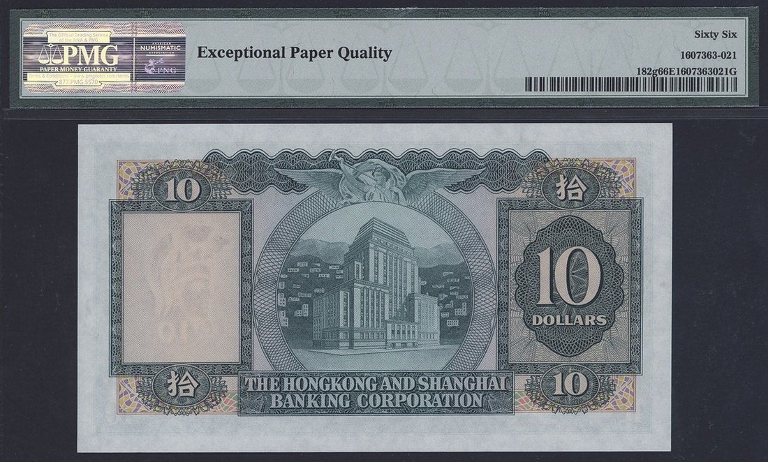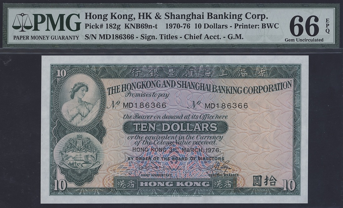 (x) HK & Shanghai Banking Corp., Hong Kong, 10 dollars, 1970-76, serial number MD186366, (Pick 182g), in PMG holder 66 EPQ Gem Uncirculated