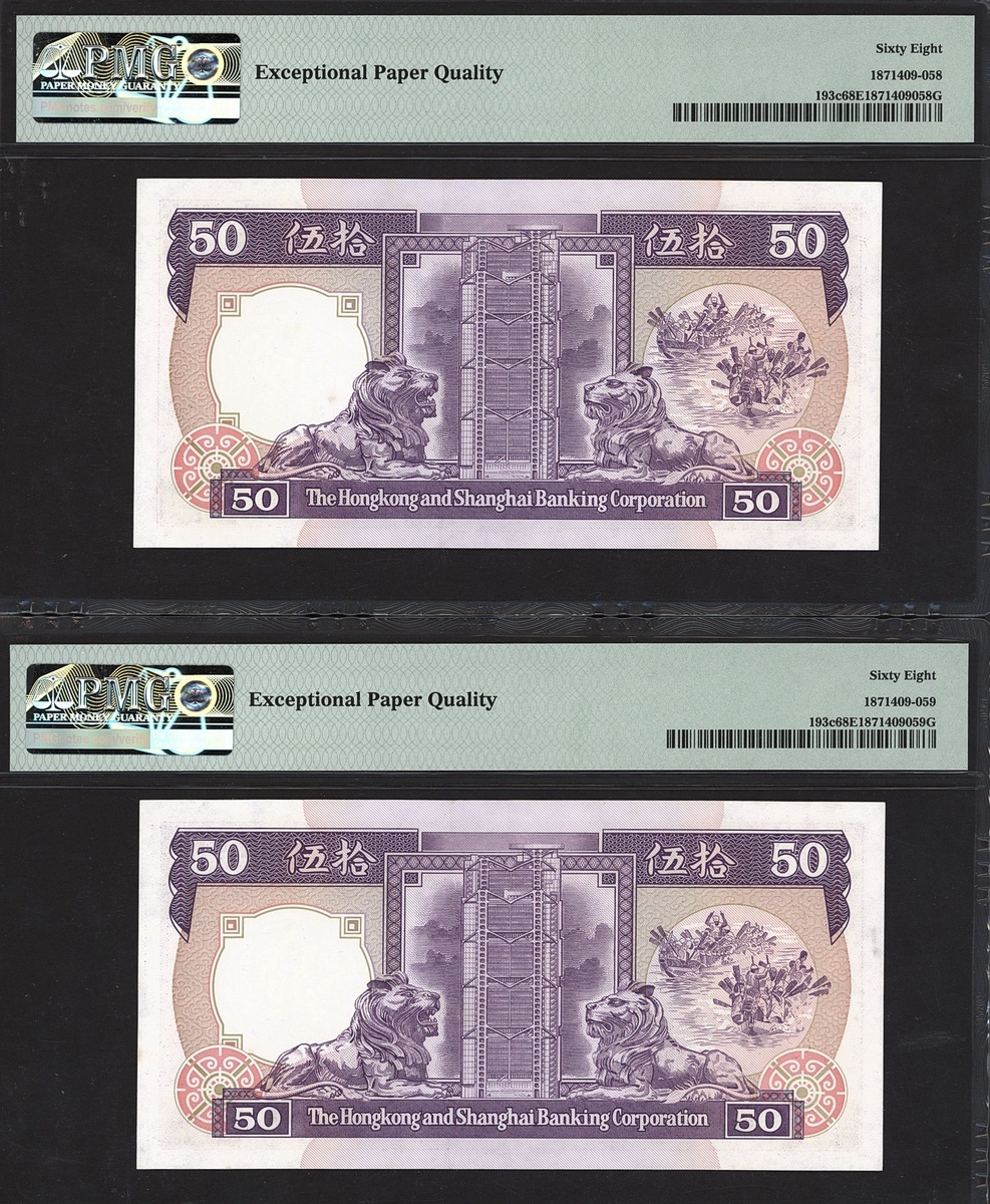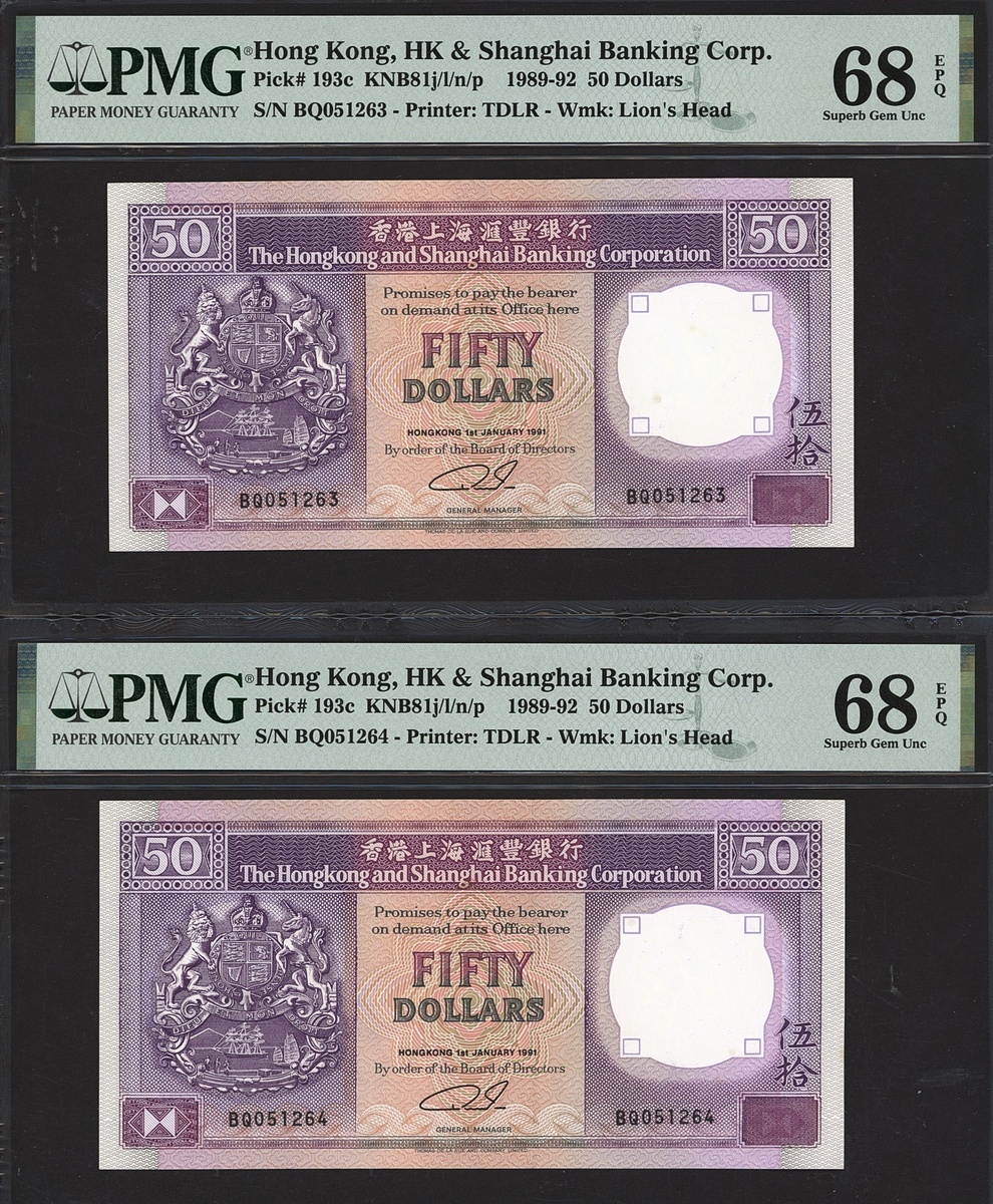 HSBC, Hong Kong, consecutive pair of 50 dollars, 1989-92, serial numbers BQ51263-4, (Pick 193c), in PMG holder 68 EPQ Superb Gem Uncirculated (2 notes)