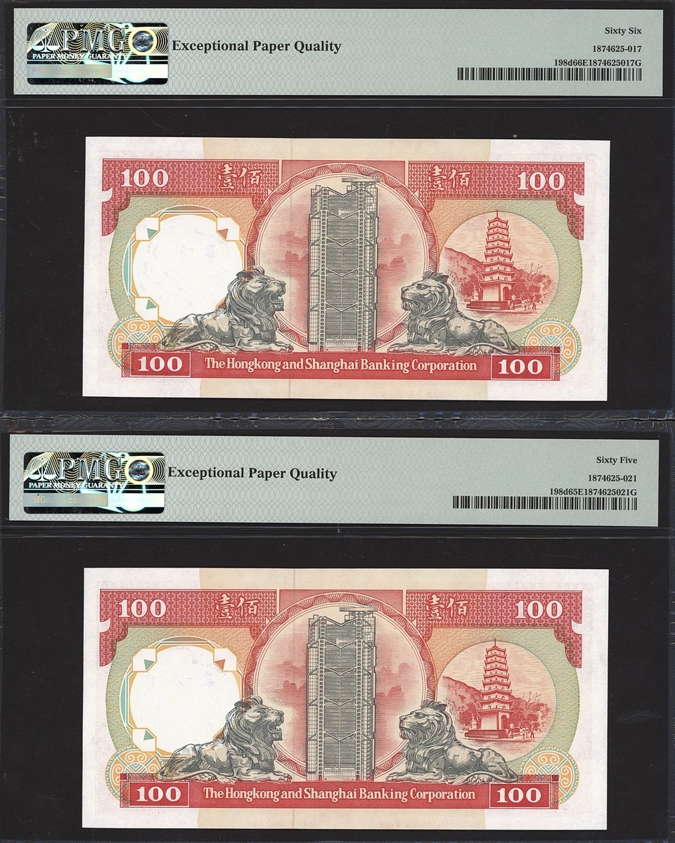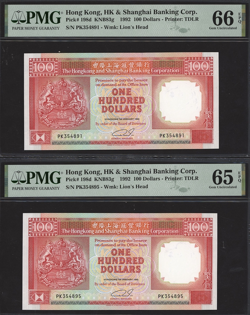 HSBC, Hong Kong, pair of 100 dollars, 1992, serial numbers PK354891, PK354895, (Pick 198d), in PMG holder 66 EPQ Gem Uncirculated, 65 EPQ Gem Uncirculated (2 notes)