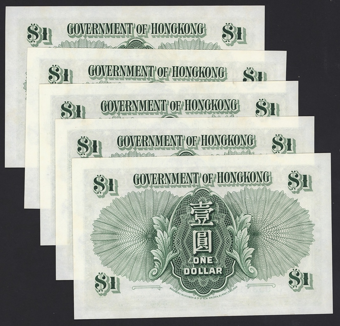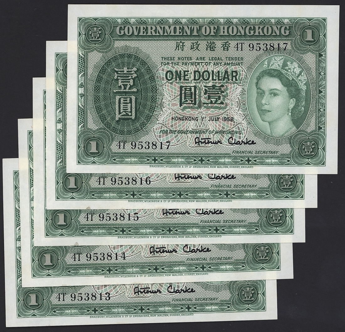 Government of Hong Kong, consecutive run of 1 dollar, 1958, serial number 4T 953813-7, (Pick 324Ab), about uncirculated (5 notes)