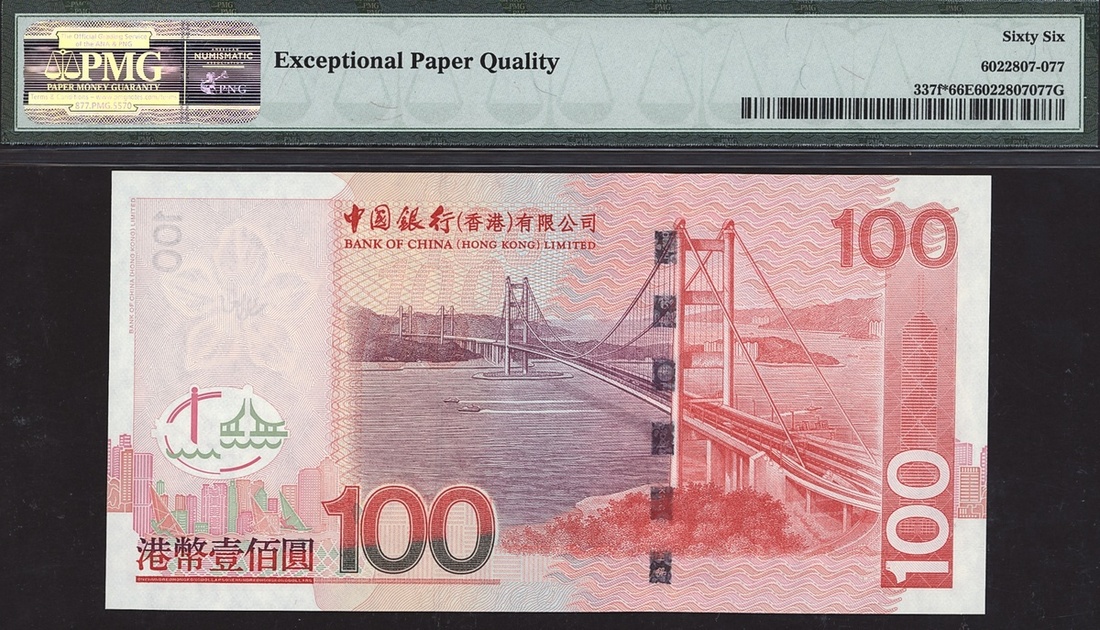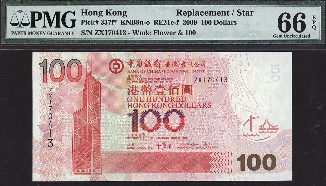 Bank of China (HK) Ltd, Hong Kong, replacement 100 dollars, 2009, serial number ZX170413, (Pick 337f), in PMG holder 66 EPQ Gem Uncirculated