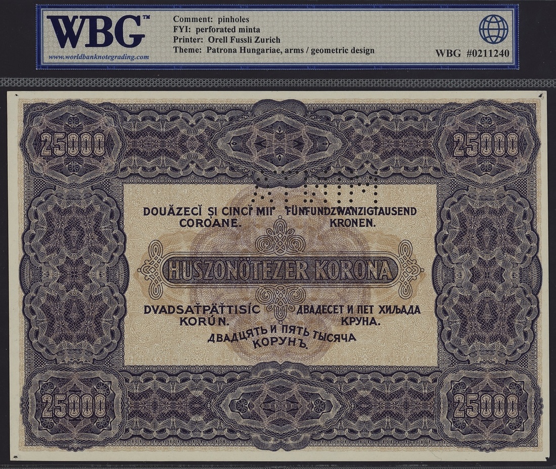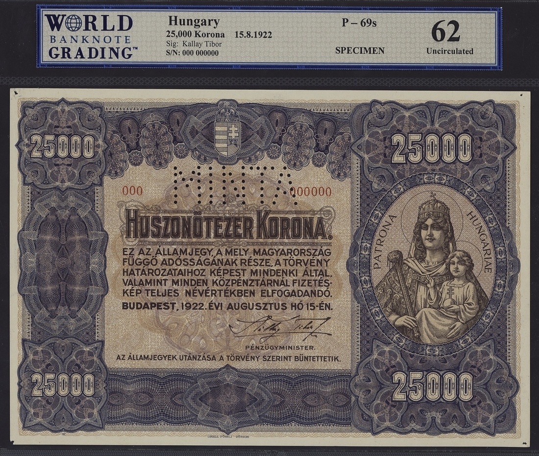 (x) Patrona Hungariae, Hungary, specimen 25,000 korona, 1922, serial number 000000000, (Pick 69s), in WBG holder 62 uncirculated, pinholes