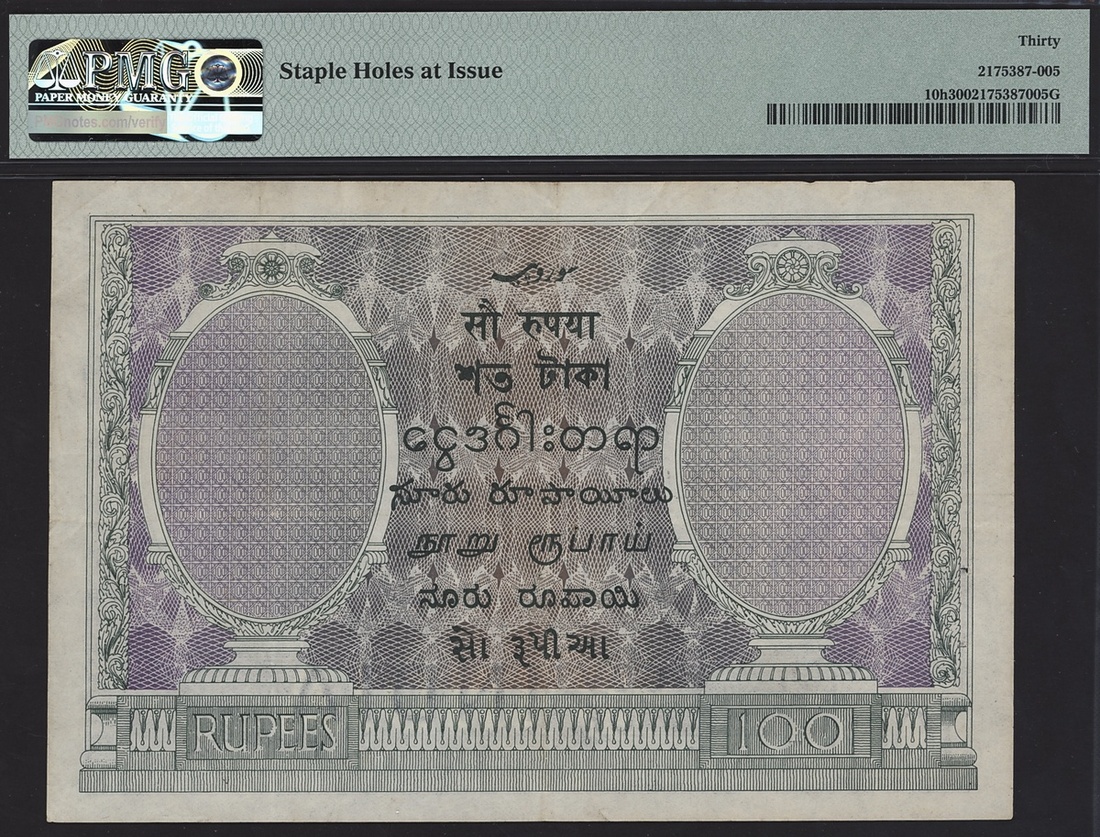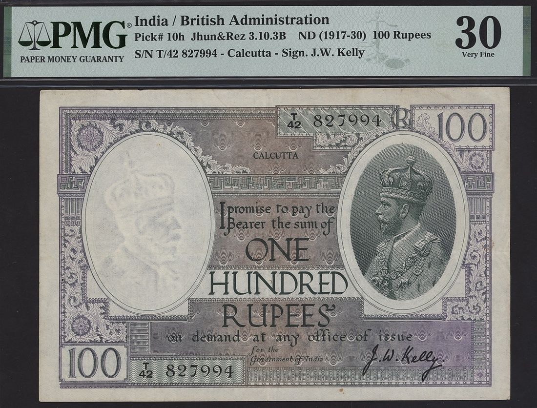 British Administration, India, 100 rupees, ND (1917-30), serial number T/42 827994, (Pick 10h), in PMG holder 30 very fine, staple holes at issue