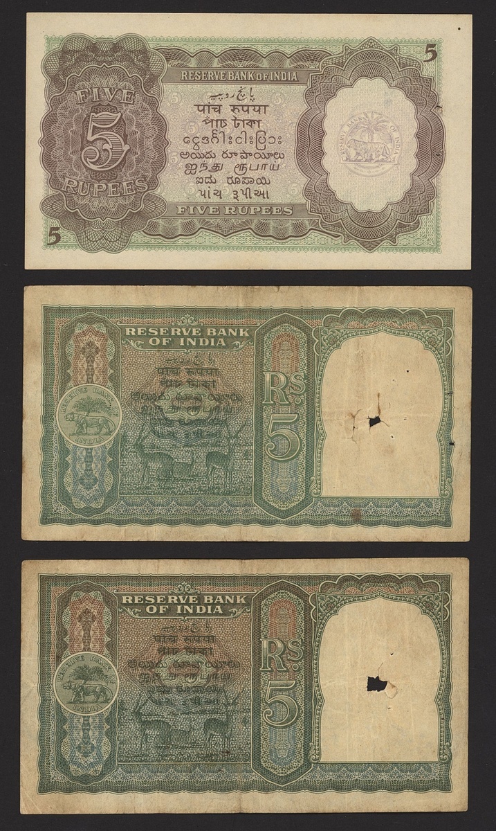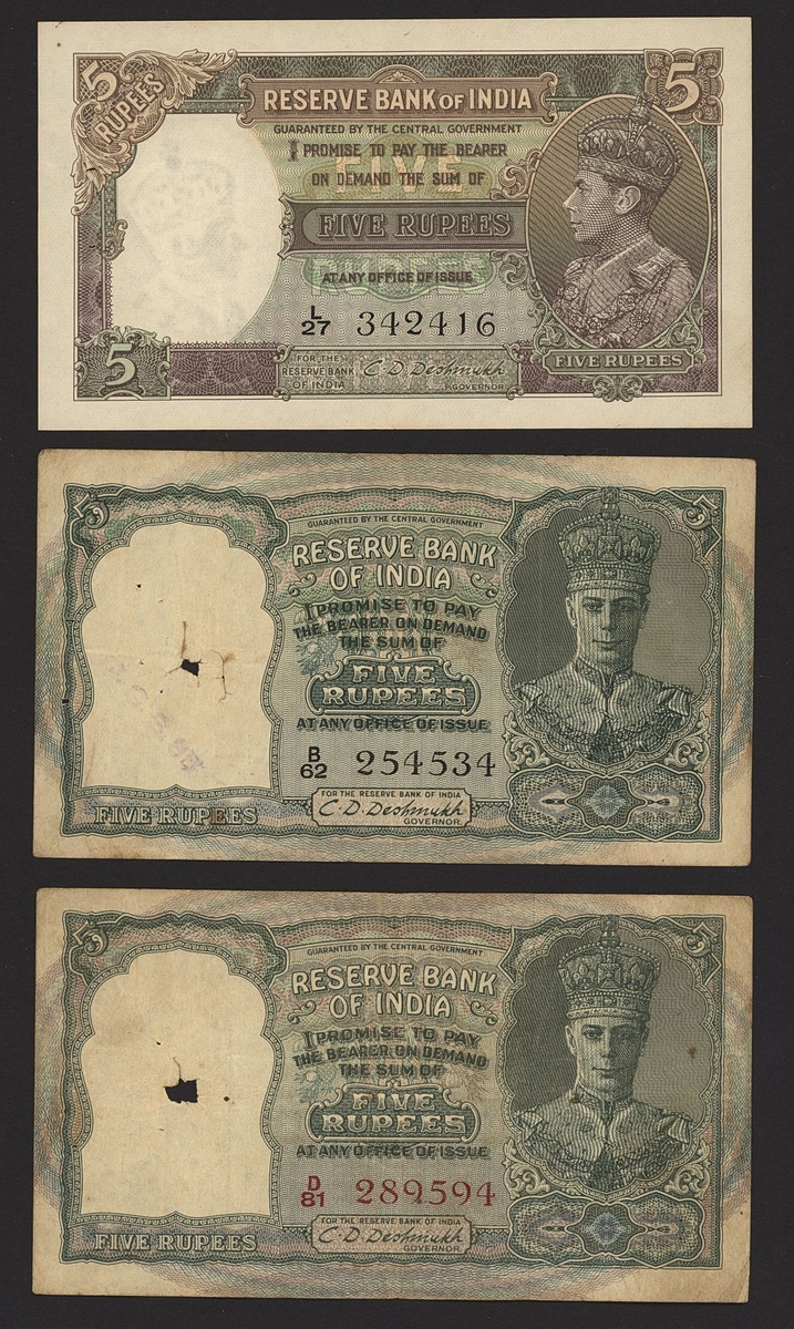 Reserve Bank of India, a trio of 5 rupees, ND (1943), serial numbers L27 342416, B62 254534, D81 289594, (Pick 18b, 23a, 23b), about uncirculated, staple holes (1), about fine, splits (2)