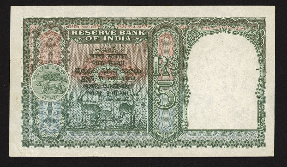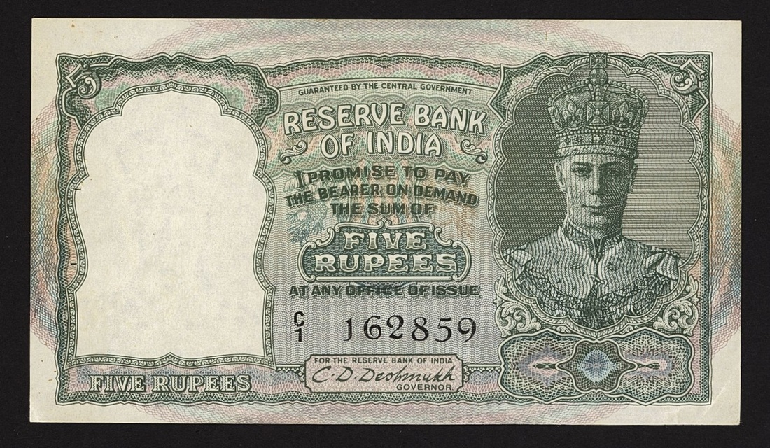 Reserve Bank of India, 5 rupees, ND (1943), serial number C1 162859, (Pick 23a), about uncirculated, staple holes
