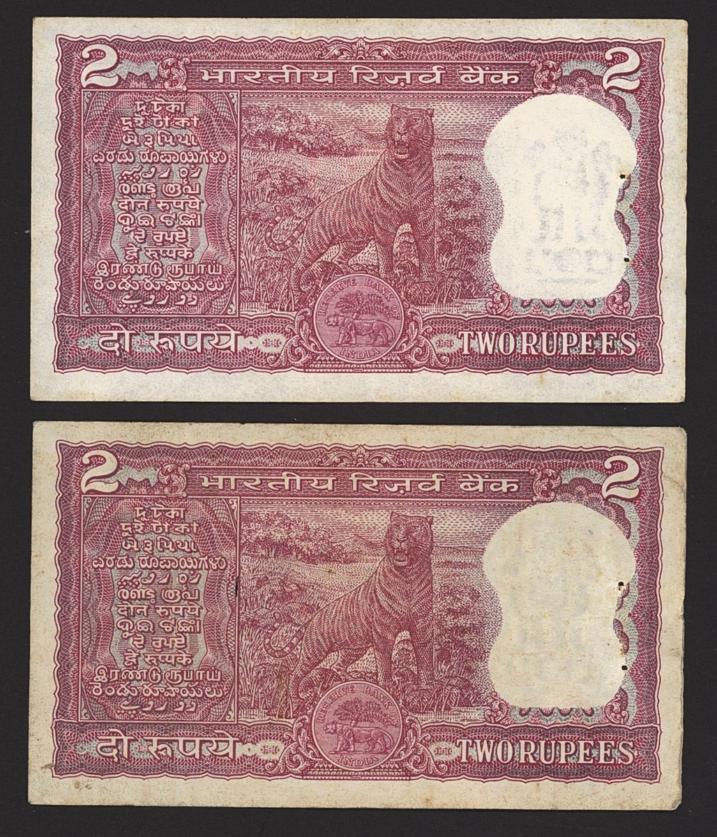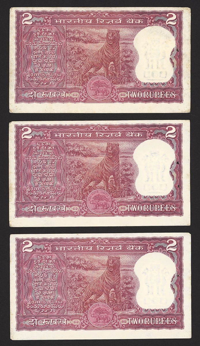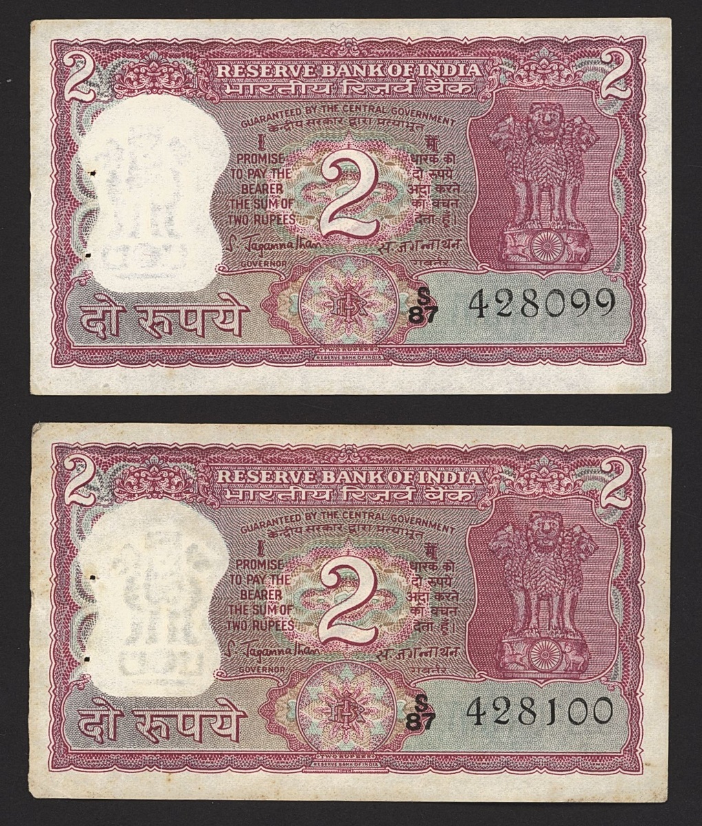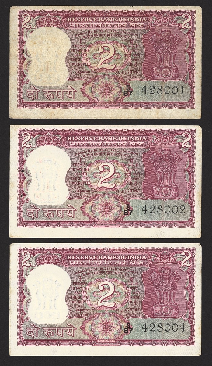 Reserve Bank of India, consecutive pair of 2 rupees, ND (1970), serial number S/87 428001-2, S/87 428004, also includes S/87 428099-100,