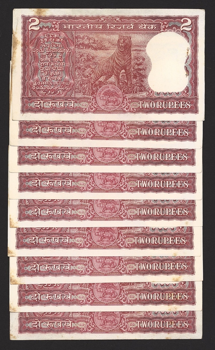 Reserve Bank of India, 2 rupees, ND (1977-82), consecutive serial numbers L/77 528001-4, L/77 528096-100, (Pick 53d), extremely fine (7), very fine (2), staining, staple holes (9 notes)