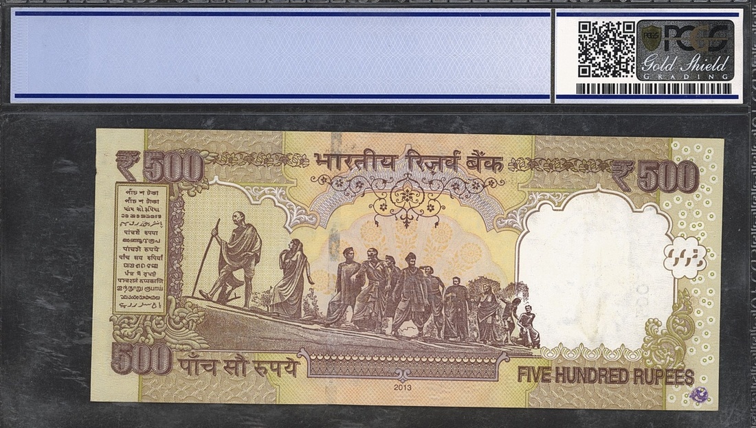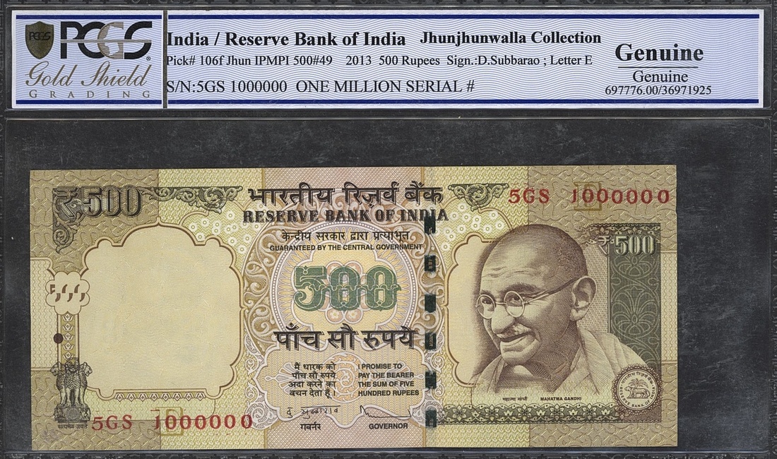 Reserve Bank of India, 1 million serial number, 500 rupees, 2013, serial number 5GS 1000000, (Pick 106f), in PCGS holder Genuine