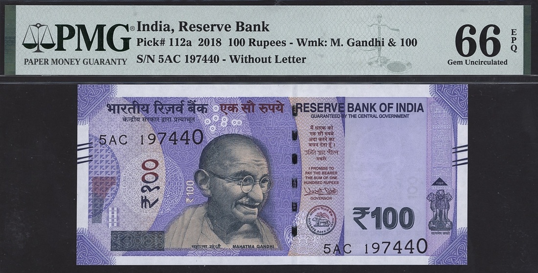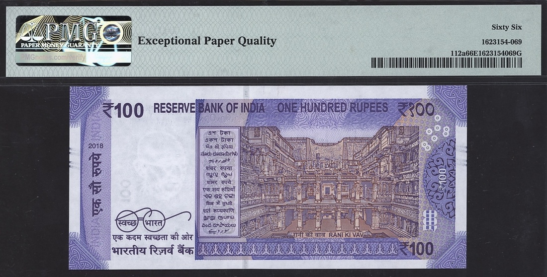 (x) Reserve Bank of India, 100 rupees, 2018, serial number 5AC 197440, (Pick 112a), in PMG holder 66 EPQ Gem Uncirculated