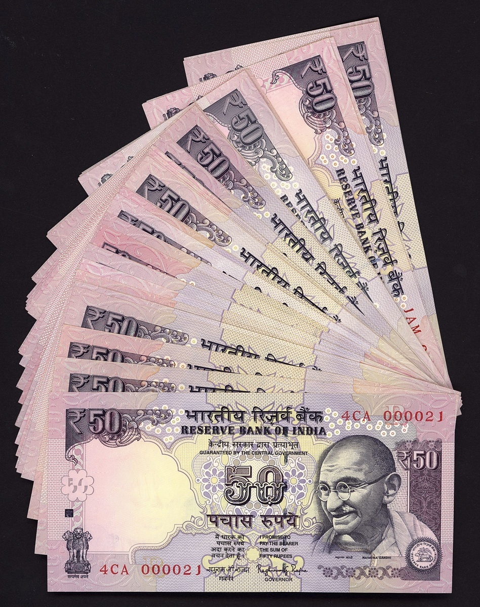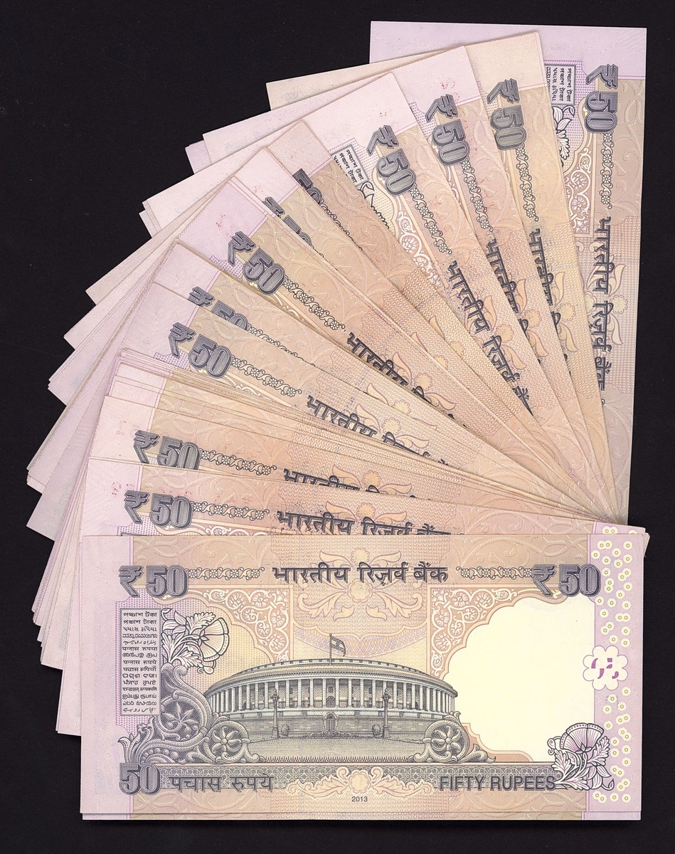 Reserve Bank of India, large group of low serial number 50 rupees, uncirculated to about uncirculated (102 notes)