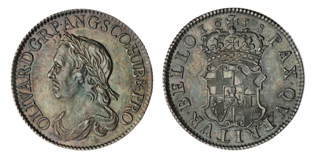 Oliver Cromwell, Shilling, 1658, by Thomas Simon, OLIVAR. D.G.R.P. ANG. SCO. HIB &C PRO, laureate and draped bust left, rev. PAX QVÆRITVR BELLO, crowned arms, straight-milled edge, 5.96g, 6h (ESC 1005; Bull 254; Spink 3228), tiny scuff before forehead and superficial scratches in field behind, probably wiped otherwise colourfully toned, near extremely fine, and ever popular amongst numismatists