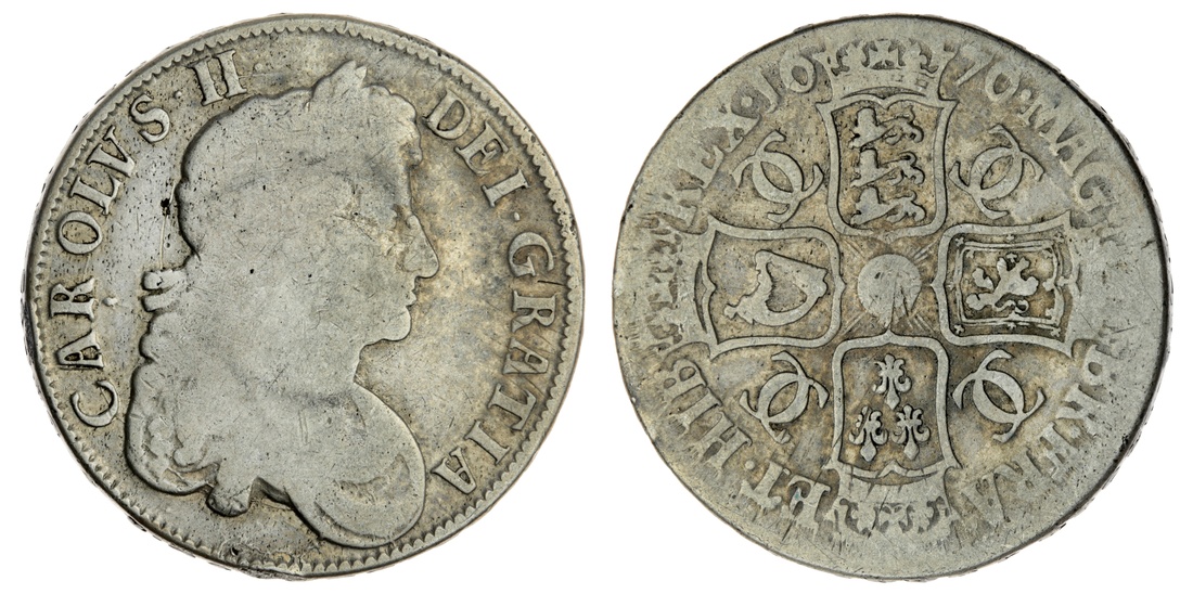 Charles II (1660-1685), Crown, 1676 VICESIMO OCTAVO, third laureate bust right, rev. crowned cruciform shields, seven strings to harp, interlinked C's in angles, lettered edge downwards, 29.45g, 5h (ESC 51; Bull 397; Spink 3358), solder marks to edge at 6 o'clock, the portrait flat and cleaned, nevertheless faint areas of toning to recesses, fair