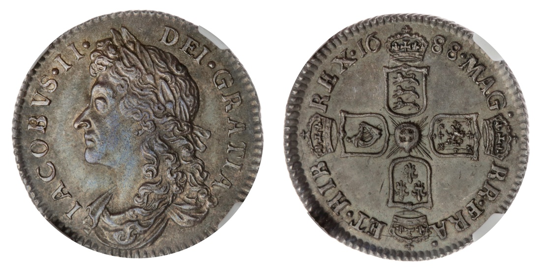 Heritage 'Long Beach Signature' 3067, 6-7 September 2018, lot 31586 - "Sixpences were a rare denomination during the reigns of Charles II, James II and William and Mary, only becoming common after the Great Recoinage of 1695. Accordingly, high grade specimens such as this delightful 1688 offering are immensely rare and hardly ever seen at auction. This example is particulary attractive aside from its rarity; toned a beautiful gray-gold, and exceptionally well produced. Barely a mark on it and indeed this appears worthy of an even higher certified grade. A superlative specimen." - $1,700