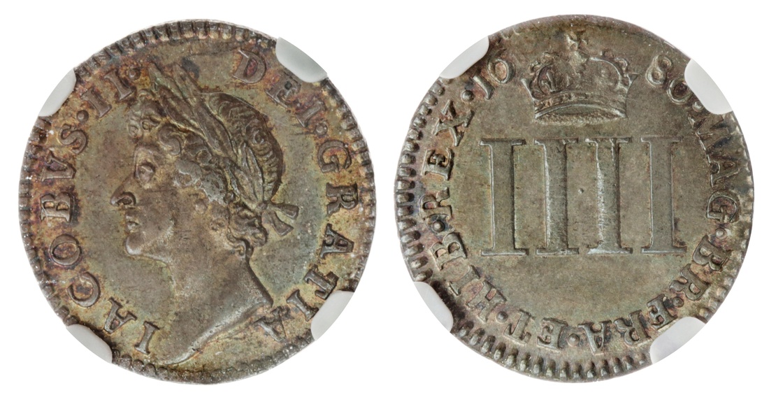 NGC MS63 | James II (1685-1688), Fourpence, 1686, laureate bust left, rev. crowned denomination, plain edge, 5h (ESC 1860; Bull 784; Spink 3414), uniform olive-grey tone to fields with colourful highlights to peripheries, almost extremely fine, in NGC holder, generously graded MS63 (Cert. #2786538-015)